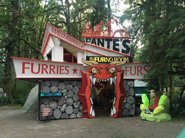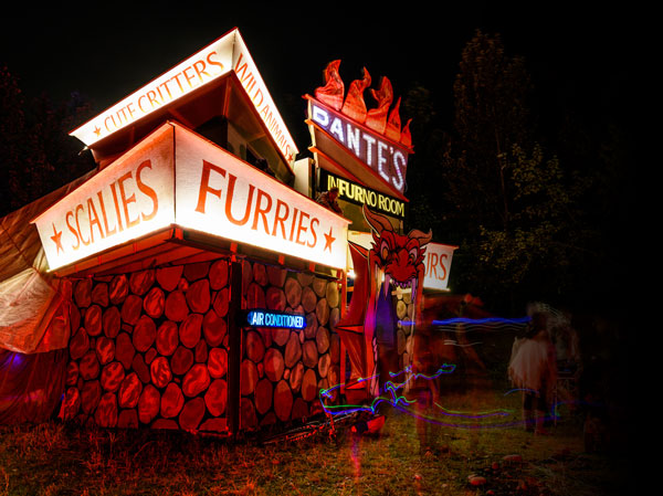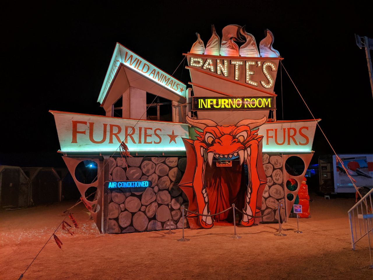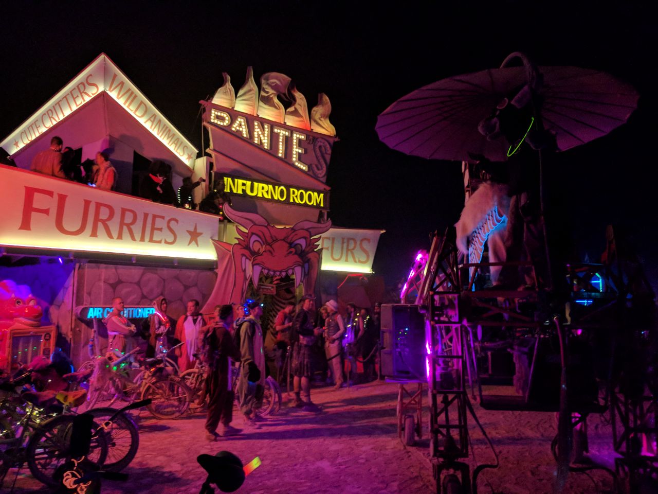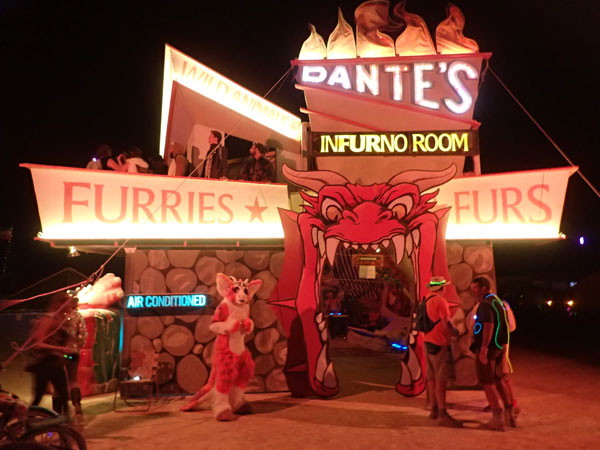 A two storey raunchy strip club heavily inspired by the movie Beetlejuice, Dante's is the sex-positive Burning Man theme camp where you can meet frisky furries, sexy critters and freaky animal people of Black Rock City.